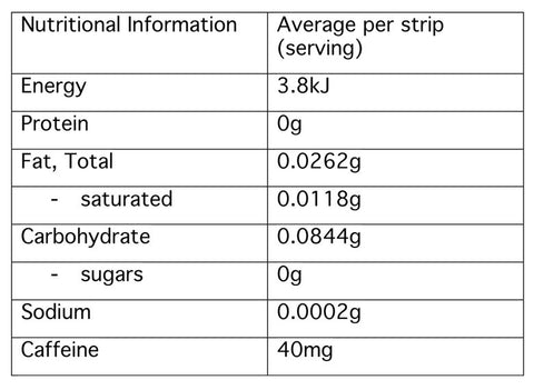 Each pocket-sized pack contains five fast-dissolving strips, each providing 40mg caffeine (approx. ½ a cup of coffee or ½ a can of an energy drink). Each strip is less than one calorie, gluten-free, and suitable for vegans.