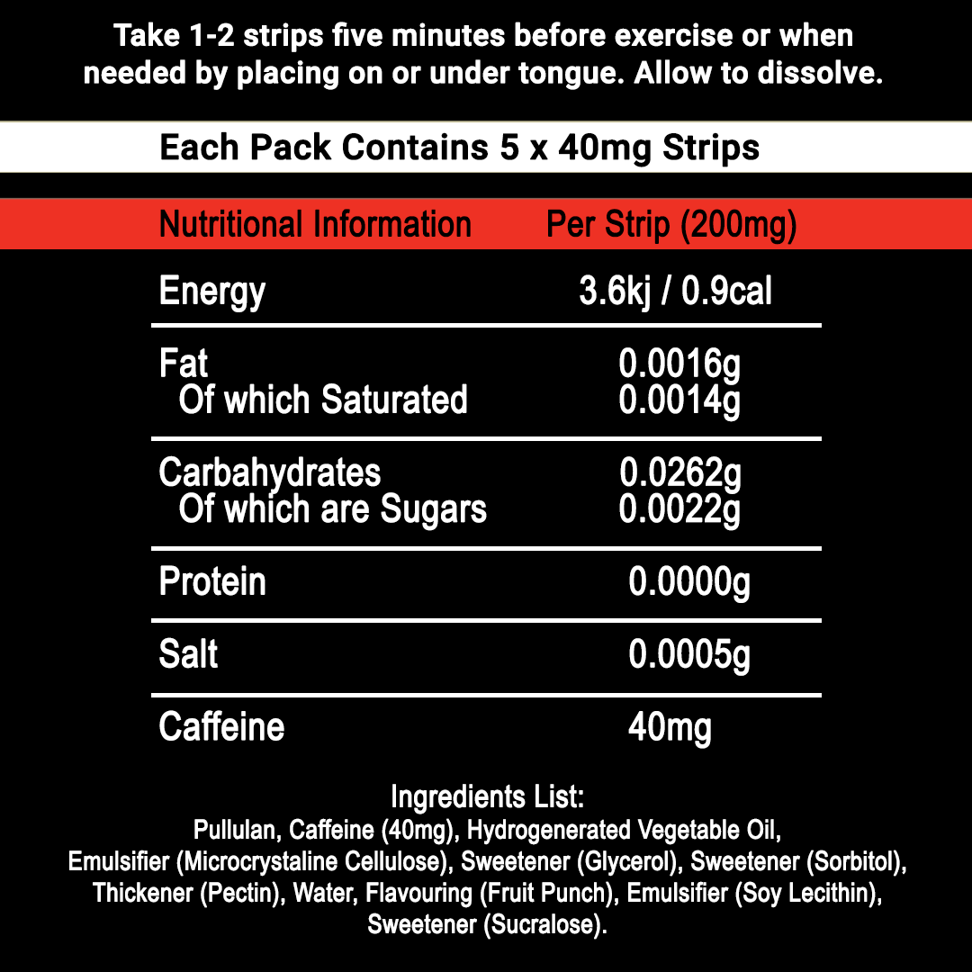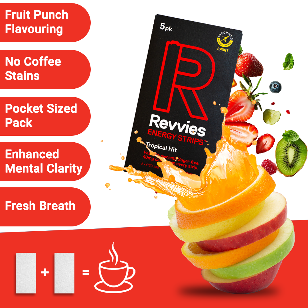 Every Revvies strip contains 40mg of caffeine (equivalent to ½ a cup of coffee). The caffeine is encapsulated in vegetable oil, which is infused on a starch base, with a small amount of flavouring and sweetener. Revvies are gluten-free, sugar-free and less than 1 calorie per strip.
