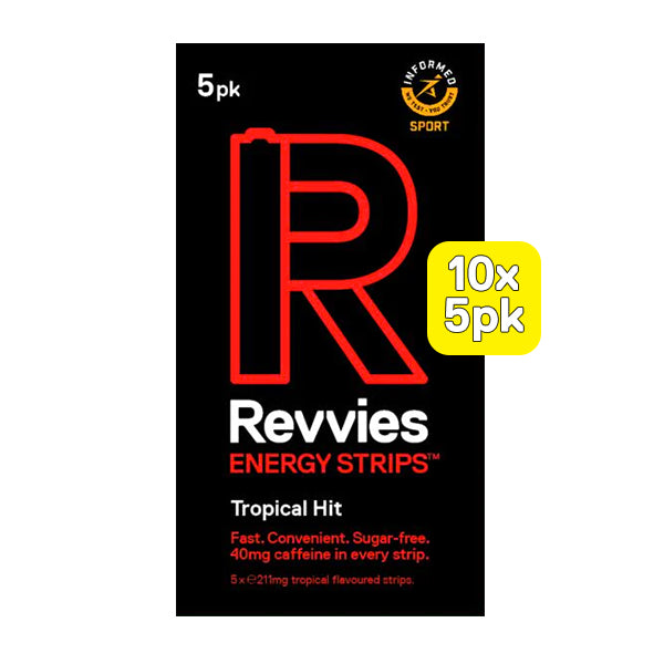 Revvies Tropical Hit provides, fast, convenient, sugar-free way to do energy. This bulk pack provides the best value with ten pocket-sized packs each containing five tropical flavoured strips.